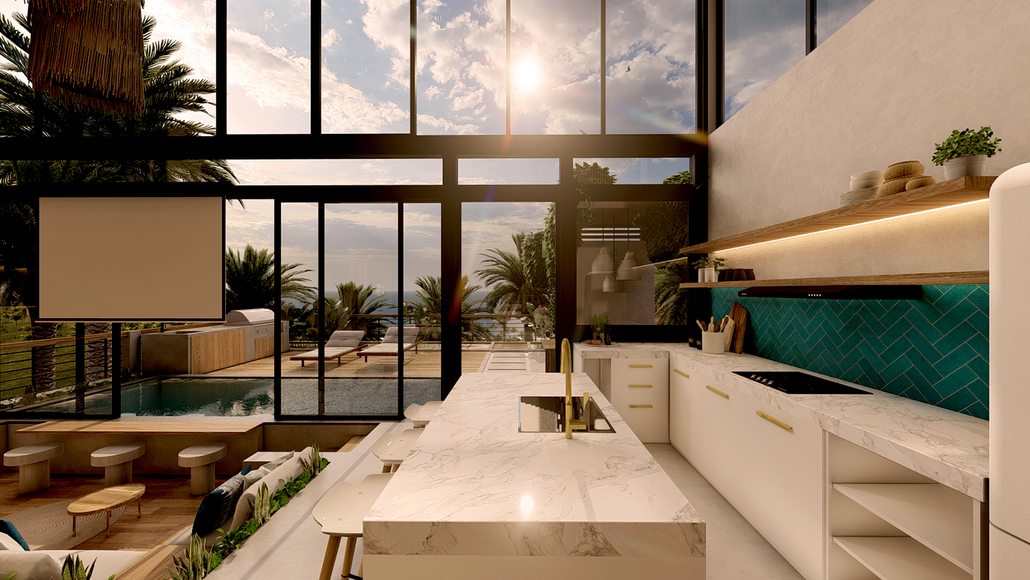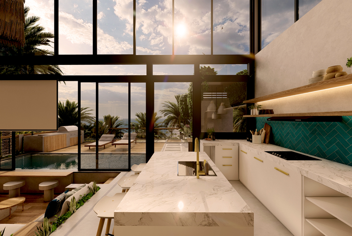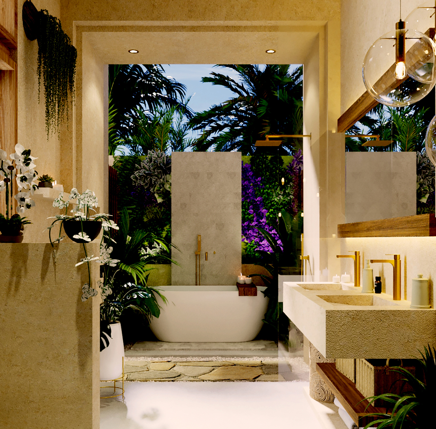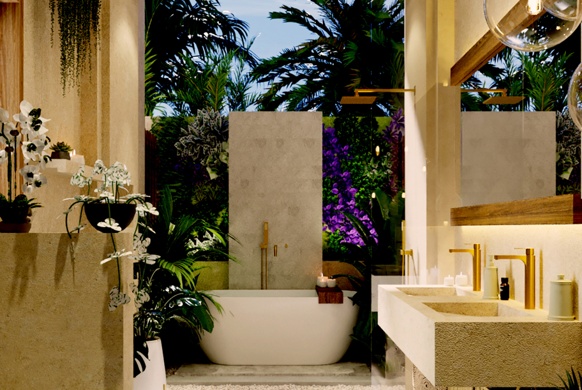Sustainable Building Materials ONLY Modern tropical Tulum-Style Sustainably harvested timber Natural stone counters Rich and calming wood tones Luxurious bronze finishes