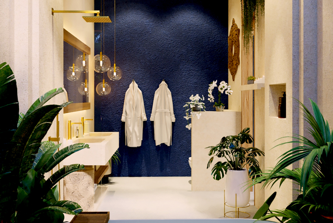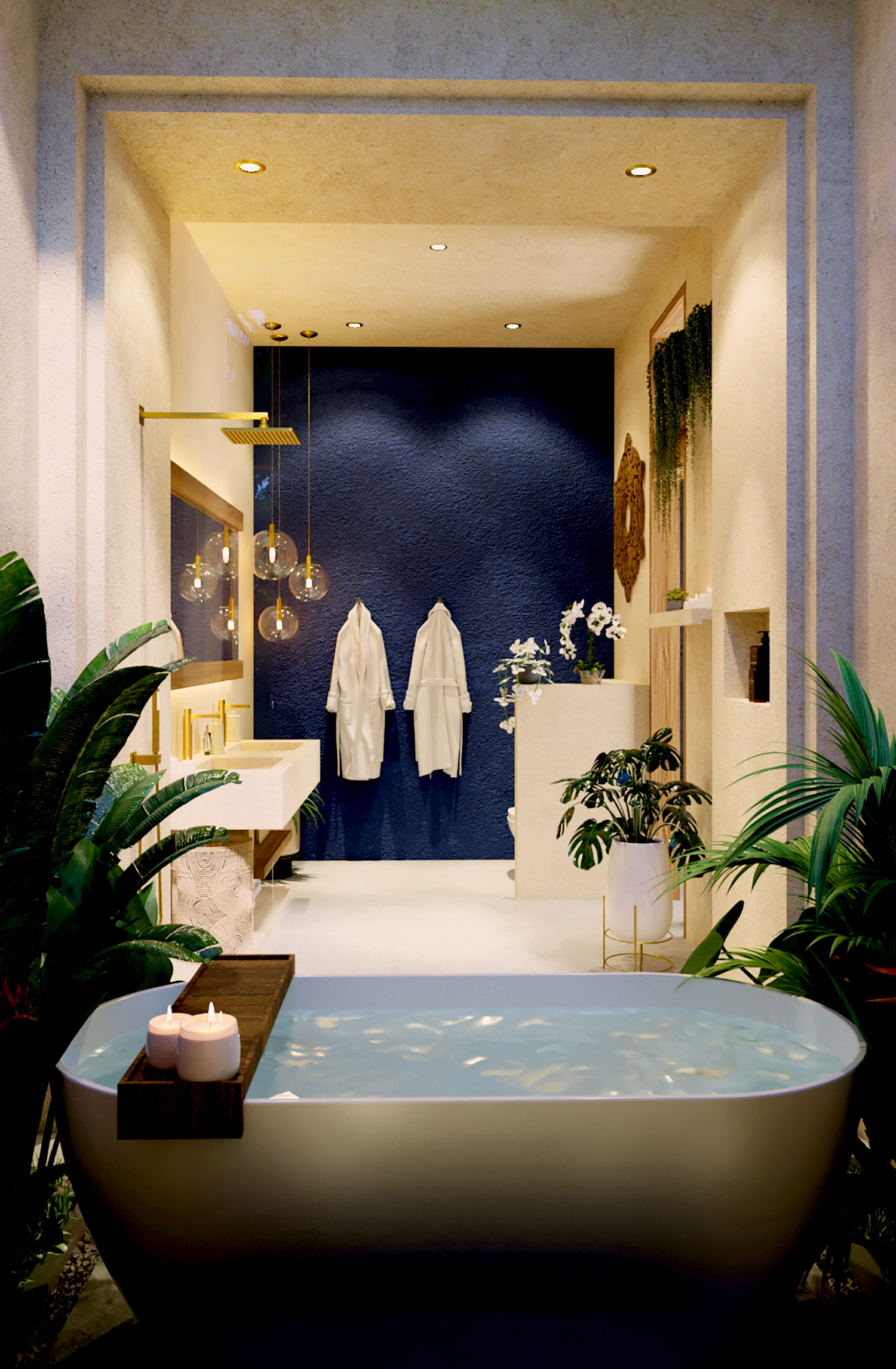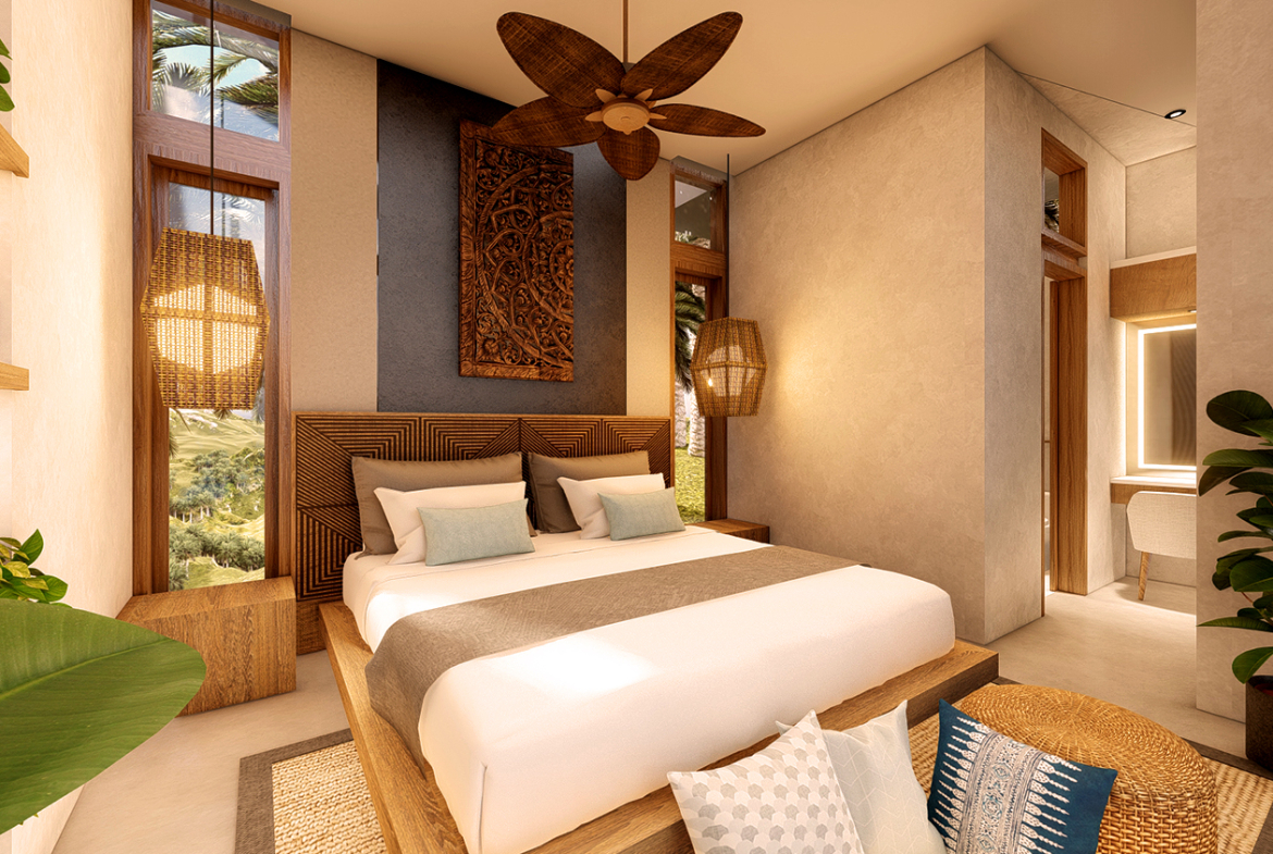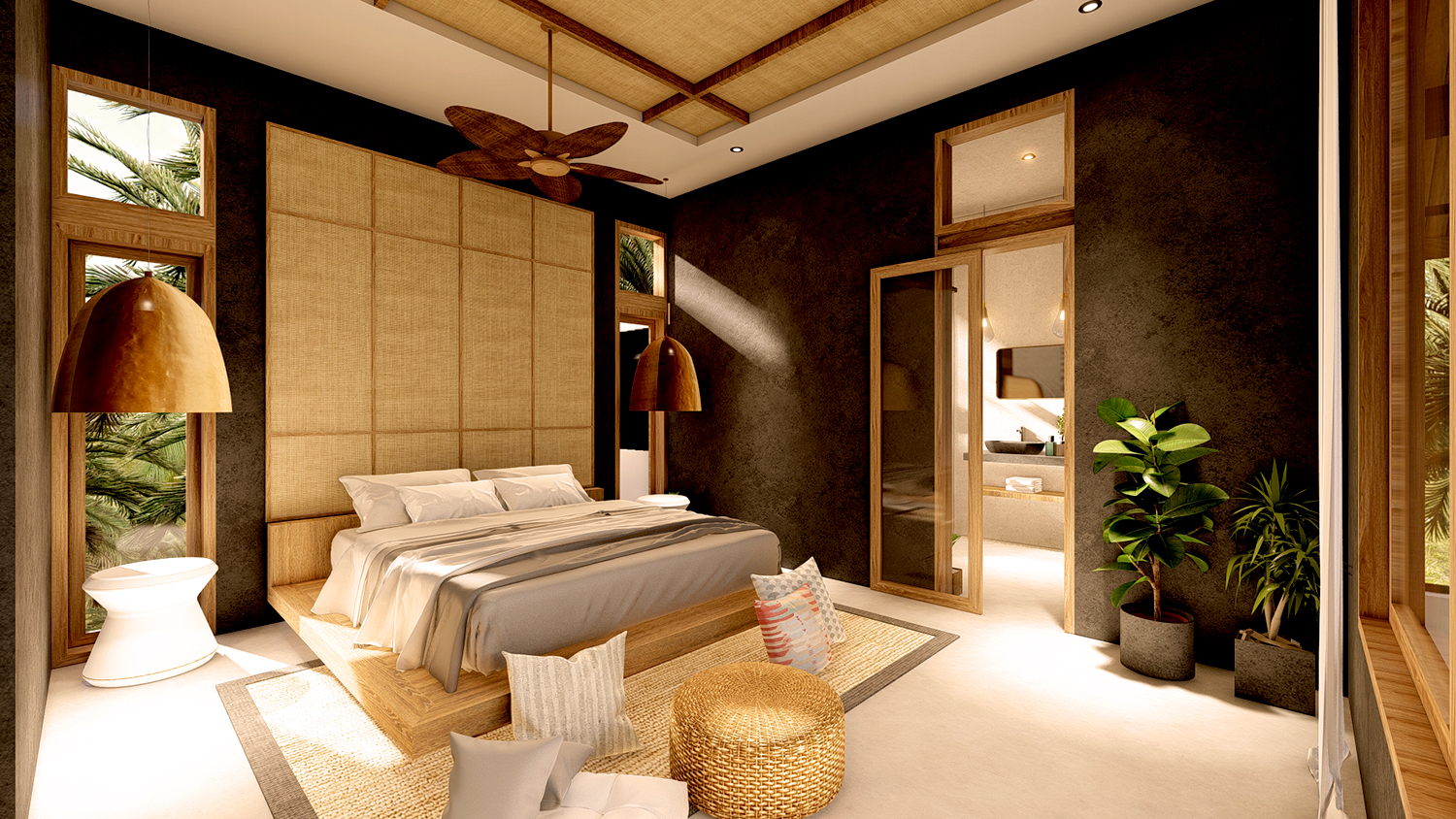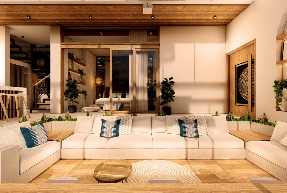 Sustainable Building Materials ONLY Modern tropical Tulum-Style Sustainably harvested timber Natural stone counters Rich and calming wood tones Luxurious bronze finishes