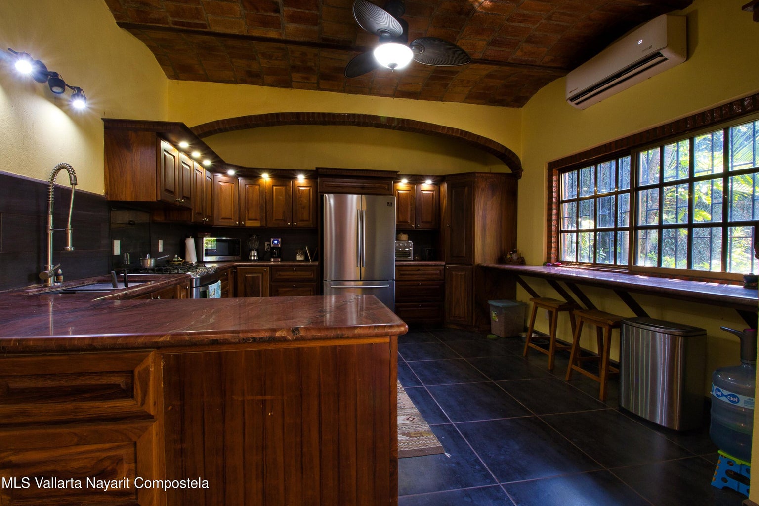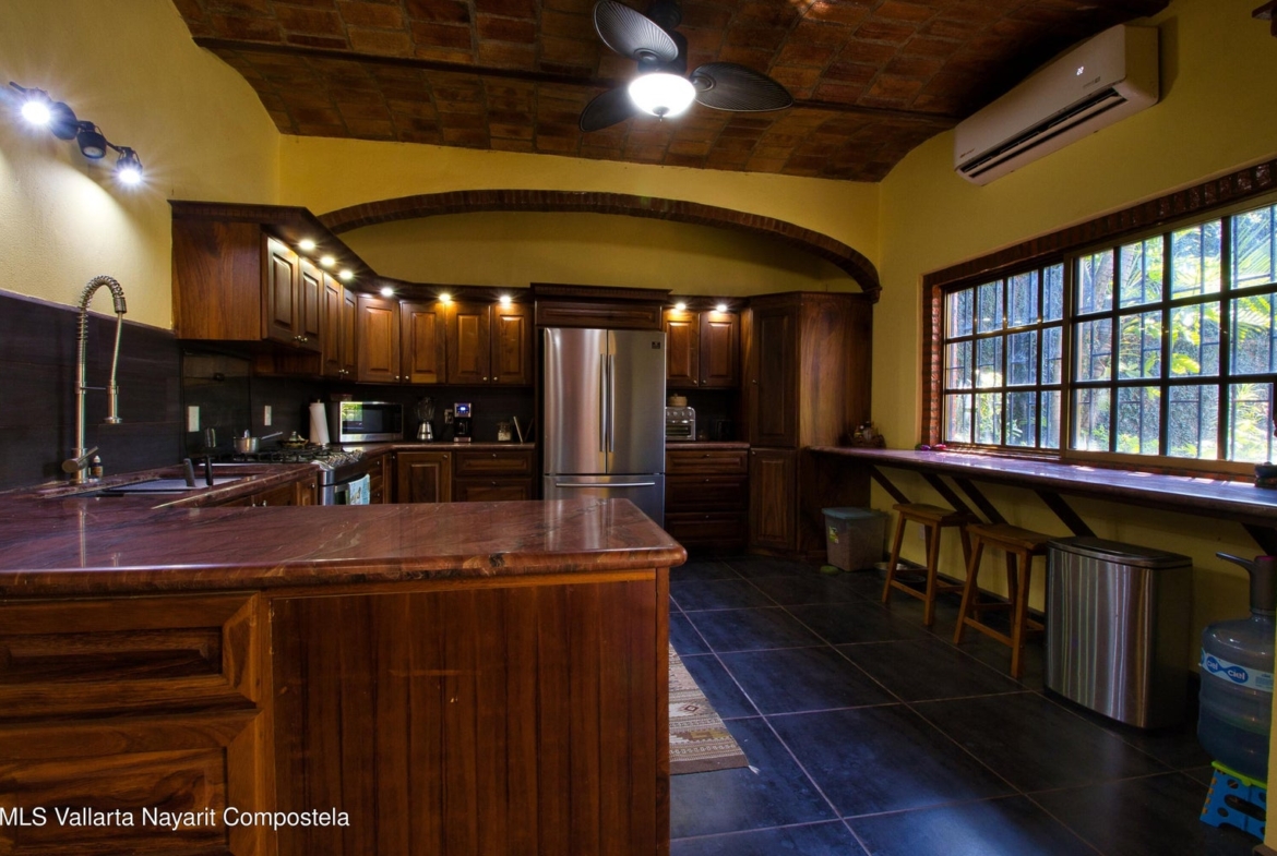 oficinas debajo. Madera de parota de calidad en toda la casa, incluidos los gabinetes de cocina puertas de armarios y puertas de entrada. Encimeras de piedra de cuarzo en la cocina, así como en las áreas de baño y escritorio. Tres aires acondicionados